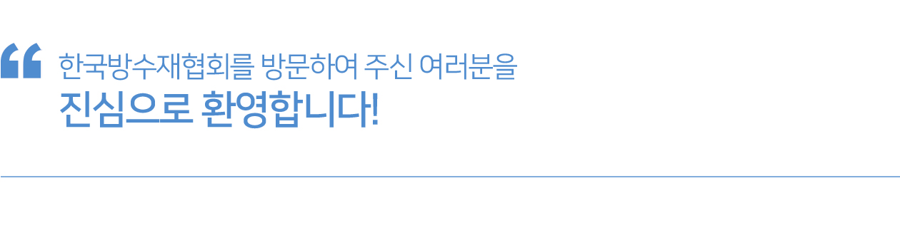 아무쪼록 (사)한국방수재협회가 우리나라의 방수산업의 발전에 중요한 역할과 책임을 다할 것을 약속드립니다. 여러분의 많은 성원을